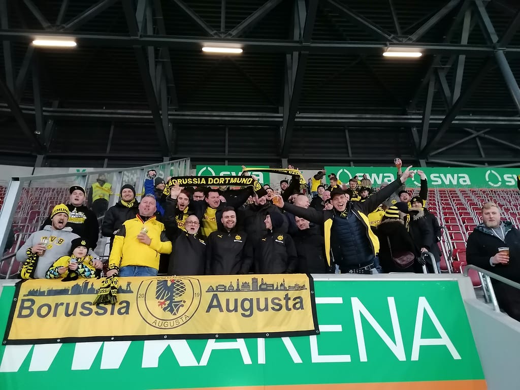 Rund 70 Fanclubmitglieder, Freunde und Verwandte konnten gesammelt Tickets ergattern. Die Ticketvergabe organisierte unser Vorstand, Dennis Hoffmann für Borussia Augusta. Unser neues Banner war bereits in der Augsburger WWK-Arena gespannt. Gut versorgt? Ab in den Y-Block. Leider fehlte die allseits bekannte Herrenhandtasche aus dem Westfalenstadion. Aus diesem Grund waren wir „nur“ mit einem 4er-Karton Bier auf dem Weg zu unseren Plätzen. Leider kann Augsburg in vielerlei Hinsichten nicht mit der deutschen Fußball-Hauptstadt mithalten. Der Anstoß wurde laut und frenetisch von Borussia Augusta bejubelt. Zeitgleich fand der Anstoß auf dem Platz statt und das Stadion war gespannt. Selbstverständlich wurden wir durch die Vereinshymne belehrt, dass wir keine Augsburger sind. Davon haben wir uns nicht aufhalten lassen – Heja, BVB.